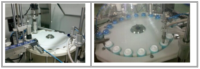 本機(jī)主要用于日化的灌裝作業(yè)。本機(jī)將灌裝、理蓋、下蓋、旋蓋三功能合在一個(gè)機(jī)體上,全過(guò)程實(shí)現(xiàn)自動(dòng)化,適用于化妝品、膏霜類產(chǎn)品、水劑等的灌裝、加熱溫控裝置還可以進(jìn)行熱灌裝。各部分的試用瓶型調(diào)整采用手柄轉(zhuǎn)動(dòng)實(shí)現(xiàn),輕松自如,簡(jiǎn)便快捷。灌裝方式采用了新型的微壓灌裝,使灌裝速度更快更穩(wěn)定,所以與同規(guī)格的機(jī)器相比本機(jī)的產(chǎn)量更高,效益更大。本機(jī)采用了先進(jìn)的可編程控制器控制機(jī)器的自動(dòng)運(yùn)行,光電檢測(cè)各部件的運(yùn)行狀況,所以自動(dòng)化程度高,操作簡(jiǎn)便。在此基礎(chǔ)上,本機(jī)變更灌裝設(shè)備,可以形成低真空灌裝方式。